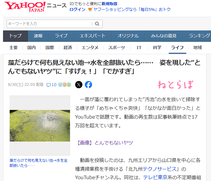 2カ月ほど前に開設しました北九州テクノサービスのYouTubeチャンネルですが、なんと2本目の動画が大バズリして27万回再生(9月1日時点)まで伸びております!チャンネル開設時にはまったく思いもよらなかった嬉しいニュースに社員一同驚いておりますが、さらに嬉しいことにネットニュースサイトの「ねとらぼ」さんが動画の記事を上げてくれまして、それがYahooニュースにまで取り上げられました。みなさんも是非ご覧になっていただければ幸いであります!